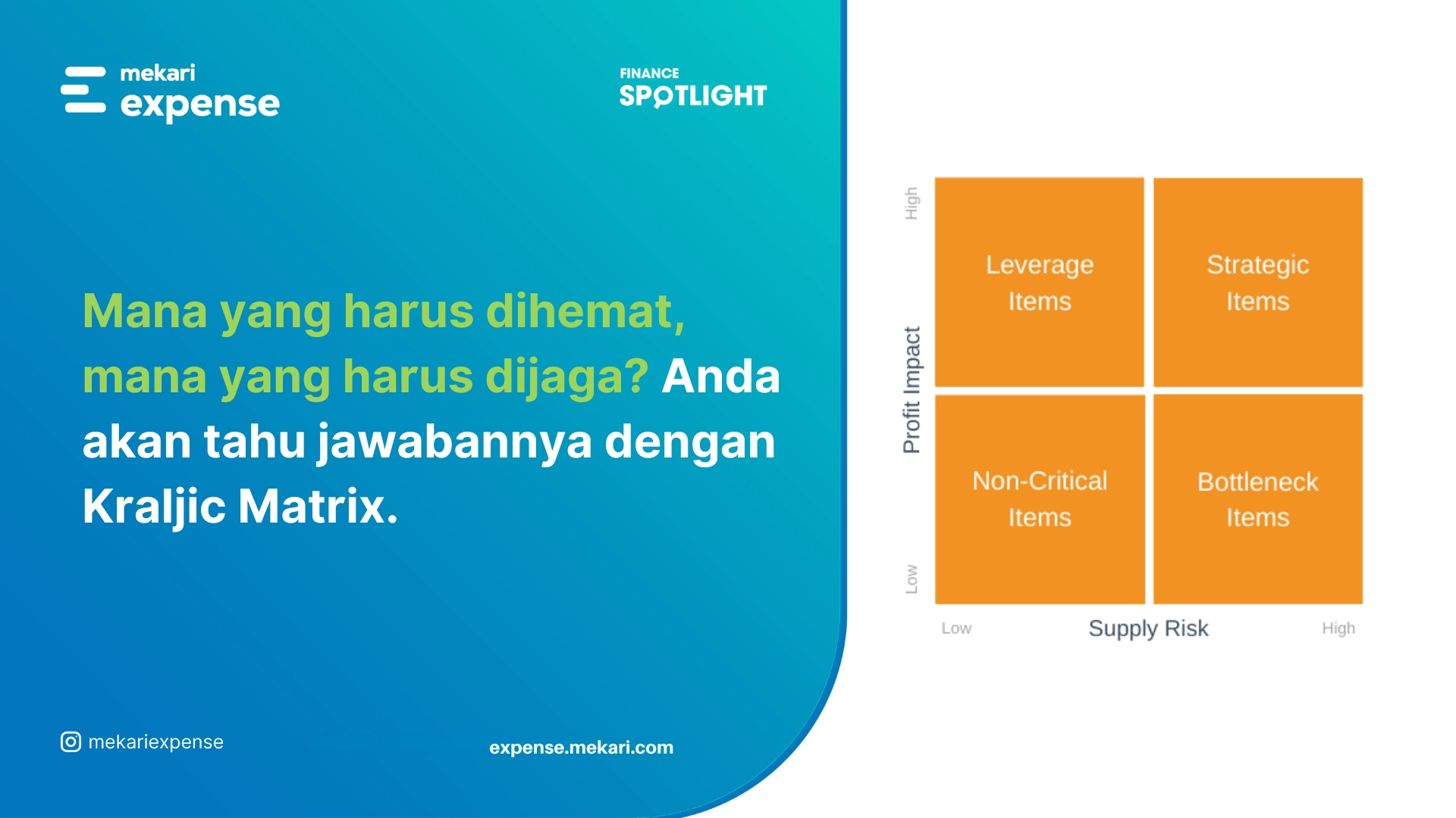 - Mekari Expense mempermudah penerapan Kraljic Matrix berbasis data. Mulai dari segmentasi otomatis, visibilitas pengeluaran per kategori, hingga analisis pola belanja historis, Mekari Expense dengan modul procurement membantu tim memetakan profit impact dan risiko dengan lebih cepat, akurat, dan real-time.