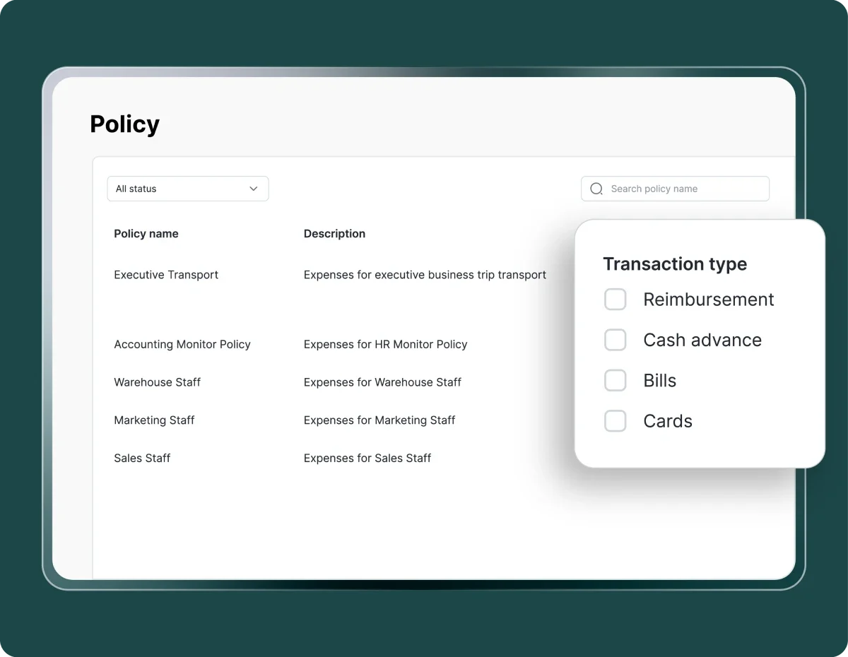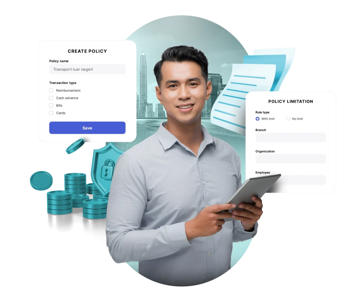 Atur dan terapkan kebijakan reimbursement, perjalanan dinas, dan penggunaan kartu sesuai kebutuhan bisnis Anda, dalam satu sistem terintegrasi.