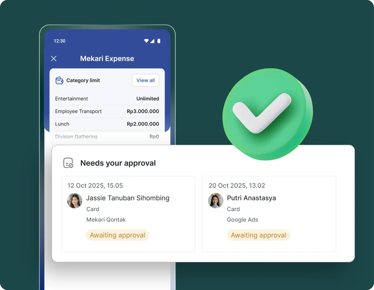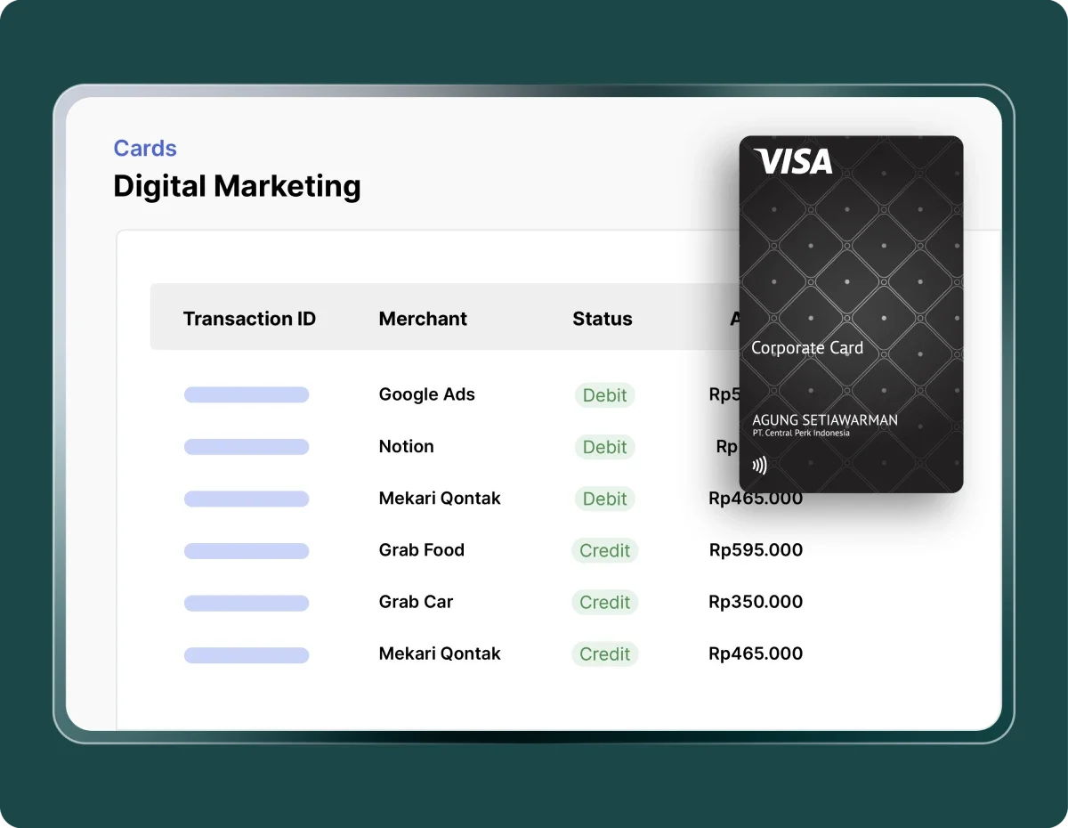 Berdayakan tim lapangan, operasional, dan procurement dengan kartu perusahaan yang otomatis mengikuti budget, alur persetujuan berlapis, dan kebijakan perusahaan.
