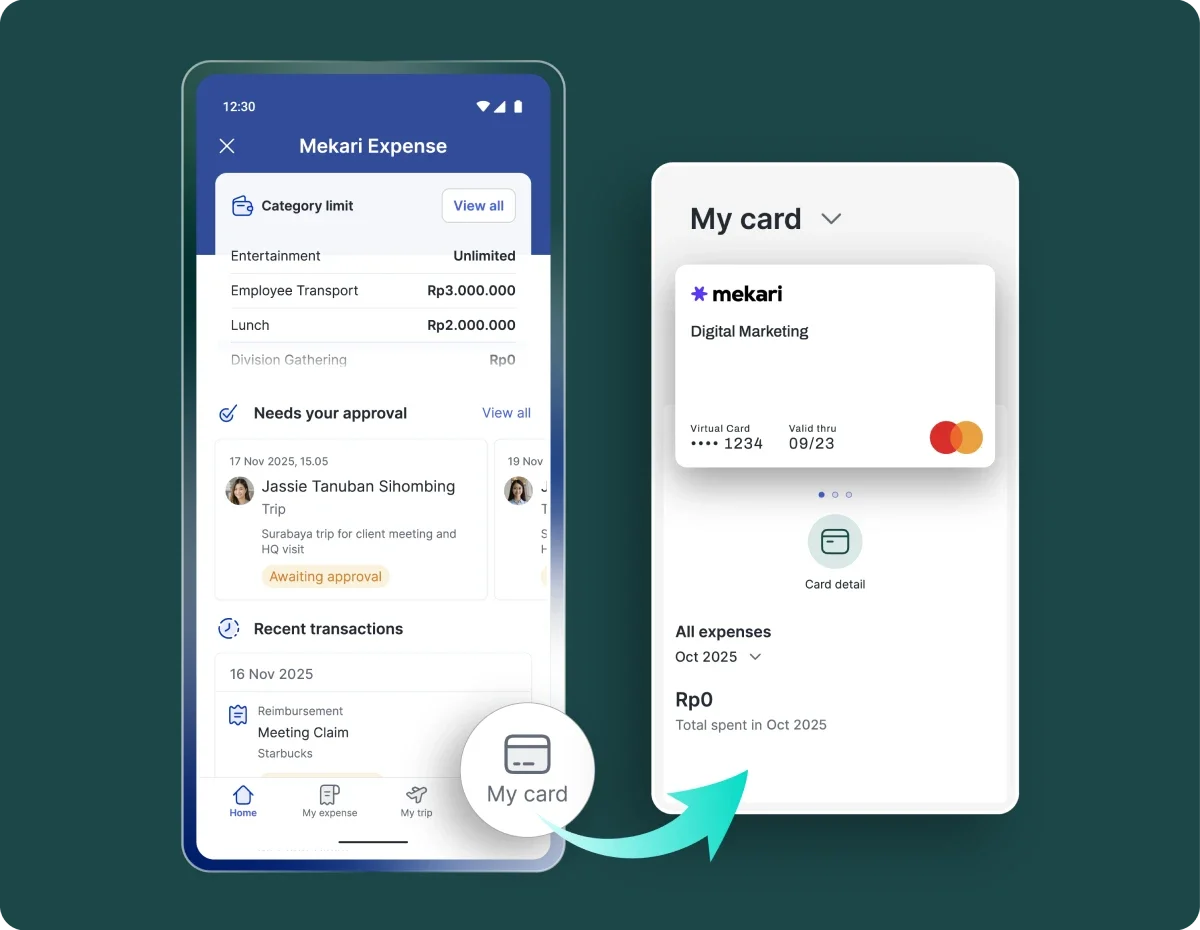 Kartu fisik dapat digunakan untuk transaksi offline, merchant fisik, maupun transaksi digital. Sedangkan kartu virtual digunakan untuk pembayaran online atau digital. Keduanya mengikuti aturan limit, persetujuan, dan policy yang sama di Mekari Expense.