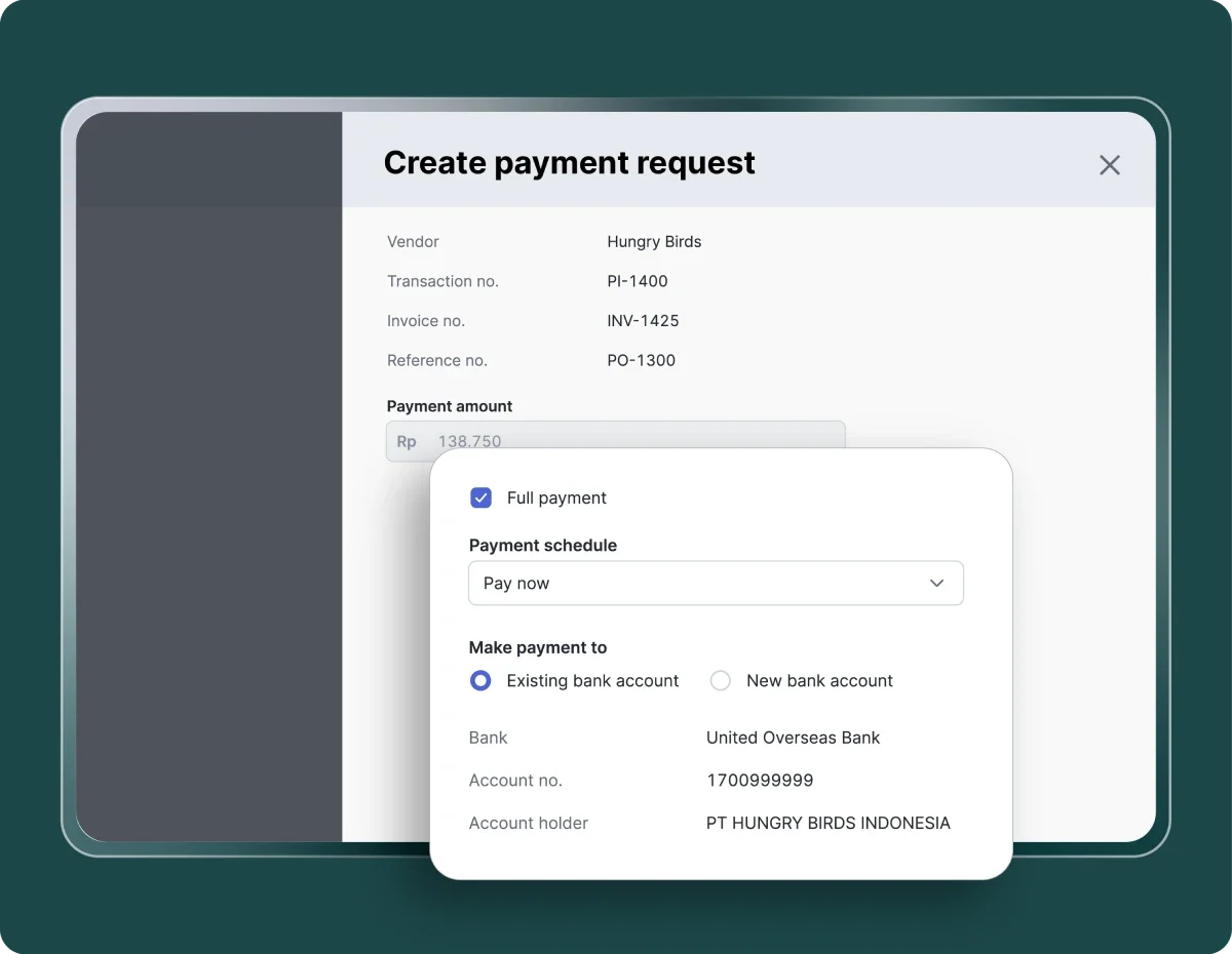 Setelah faktur disetujui, tim finance dapat membuat permintaan pembayaran dengan jadwal yang fleksibel.