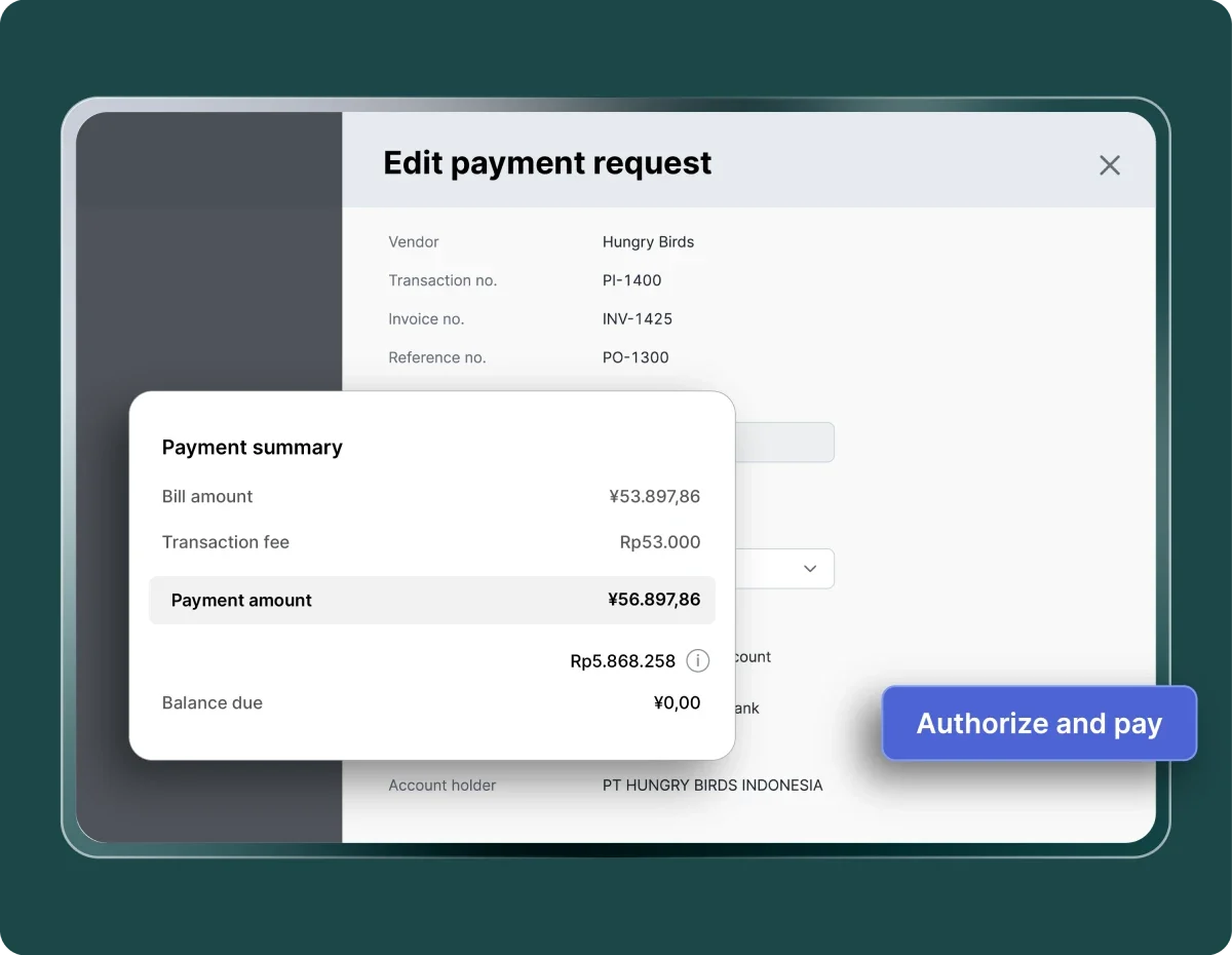 Bayar vendor langsung dari aplikasi, lengkap dengan bukti pembayaran dan dukungan kurs mata uang asing.