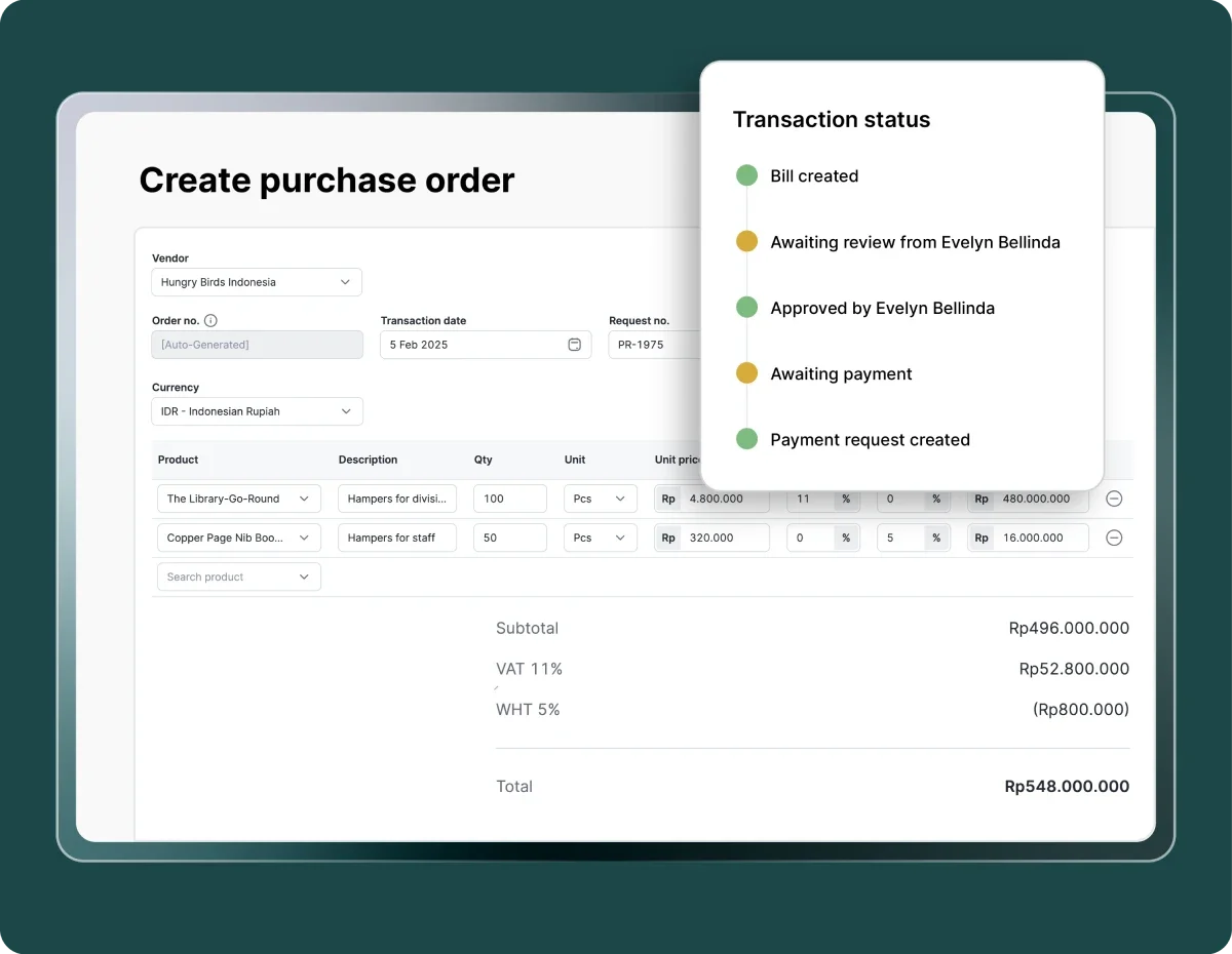 Kelola seluruh proses pengadaan mulai dari pembuatan PO, pembayaran deposit, vendor, produk, hingga gudang bisa lebih cepat, transparan, dan sesuai kebijakan perusahaan.