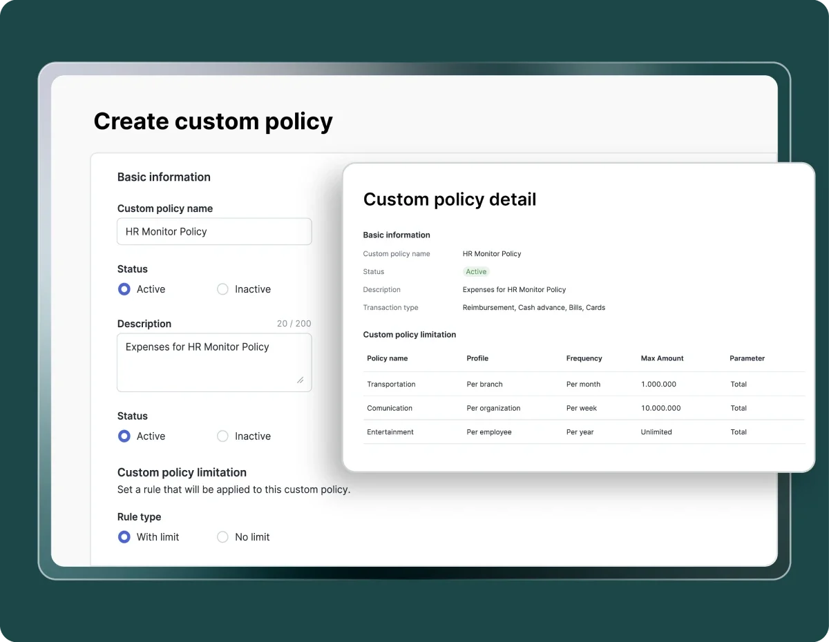 Atur limit, kategori belanja, hingga aturan perjalanan dinas secara otomatis sesuai kebutuhan bisnis.