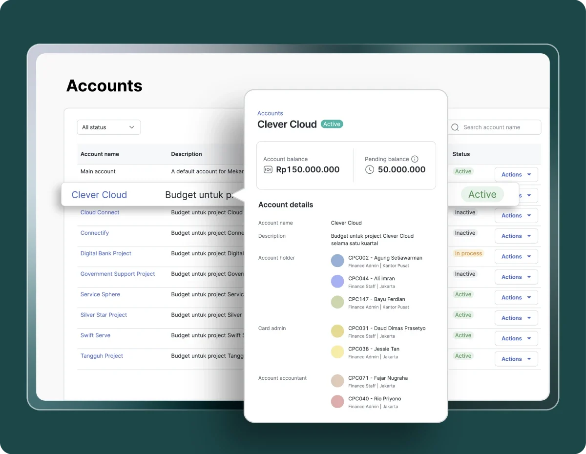 Kelola berbagai akun budget dari satu dashboard dengan kontrol kas yang lebih kuat dan transparan.