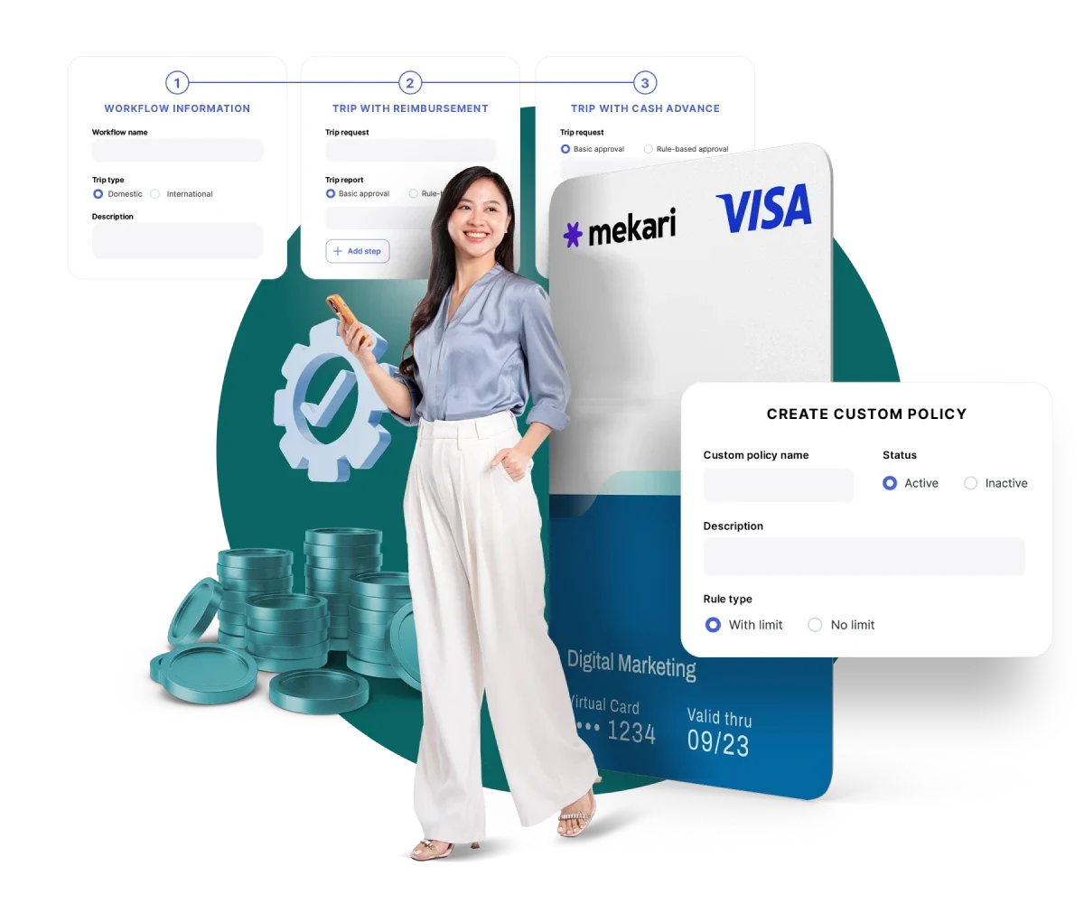 Kartu perusahaan virtual & fisik, ditambah custom policy memastikan hanya transaksi sesuai aturan yang bisa lolos.
