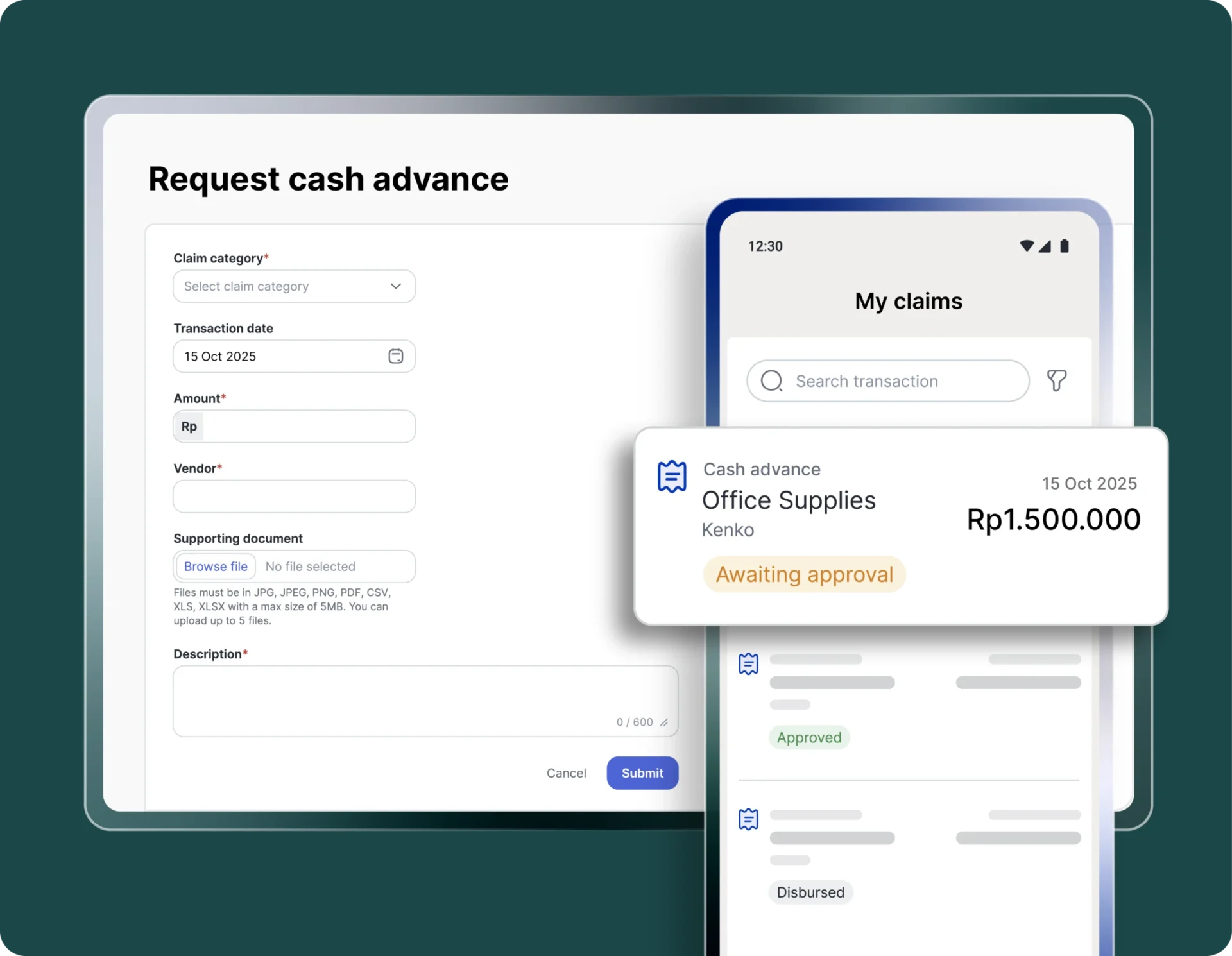 Ajukan, setujui, dan pantau uang muka karyawan secara mudah dalam satu platform.